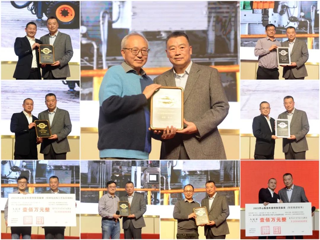 今年年會的重頭戲是首次頒發的特別貢獻獎。今年的創新特別貢獻獎分別授予了開山重工集團股份有限公司研究院研制的智能掘進鉆車和開山通用機械研究院研制的低碳氫冶煉工藝氫壓縮機,這兩項科研成果在國內市場創造了較好的經濟效益和社會效益。集團委托上海造幣廠特制的純金獎牌頒發給了湯炎博士以及夏劍輝、徐雪峰、惠登峰、田兵兵等四位高級工程師;另有純銀獎牌頒發給了技術團隊參與兩項創新產品開發的工程技術人員。